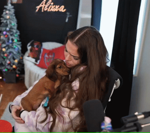 Descrierea conținutului: a woman is holding a small brown dog in front of a sign that says ' alina '
