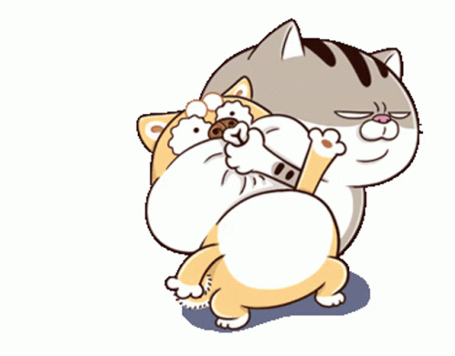 Descrierea conținutului: two cartoon cats are hugging each other and one is holding another cat 's tail