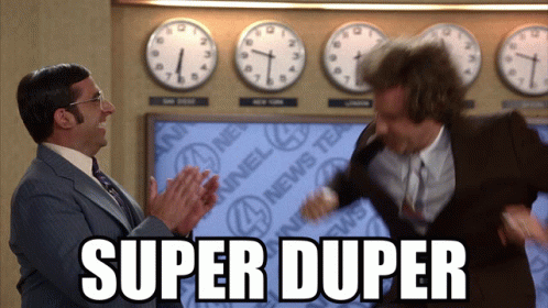 Descrierea conținutului: two men are clapping in front of a wall of clocks with the words super duper above them