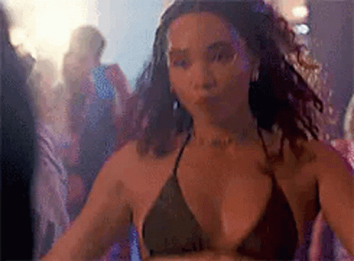 Descrierea conținutului: a woman in a bikini top is dancing in a club with other people .