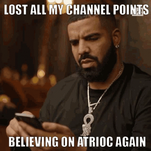 Descrierea conținutului: a man with a beard is looking at his phone with the caption lost all my channel points