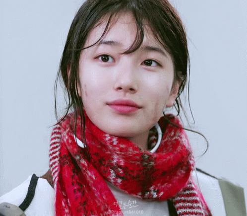 Descrierea conținutului: a close up of a woman wearing a red scarf with the number 641010 on the bottom left