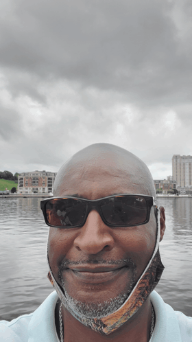 Descrierea conținutului: a man wearing sunglasses and a face mask is smiling