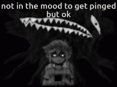 Descrierea conținutului: a black and white drawing of a monster with the words not in the mood to get pinged but ok .