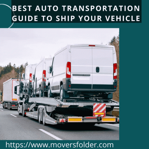 - Descrierea conținutului: a truck carrying a bunch of vans with the website https://www.moversfolder.com written on the bottom