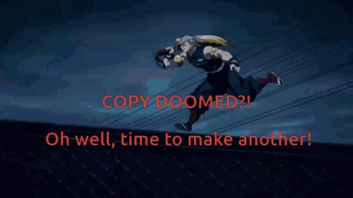 Descrierea conținutului: a picture of a anime character with the words copy doomed