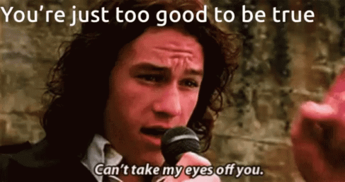 Descrierea conținutului: a man singing into a microphone with the words you 're just too good to be true