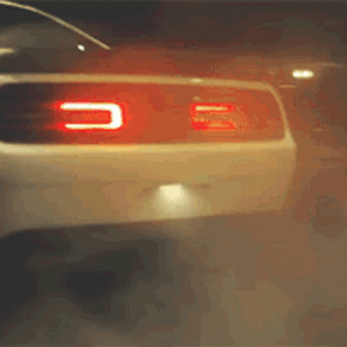 Descrierea conținutului: a white car is driving down a street at night with smoke coming out of the back