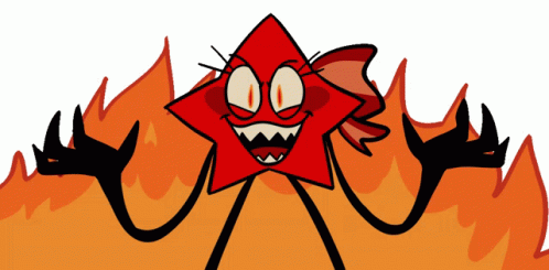 Descrierea conținutului: a cartoon drawing of a red star with a scarf around its neck surrounded by flames