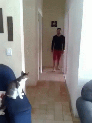 Descrierea conținutului: a man is walking down a hallway with a cat sitting on a couch .