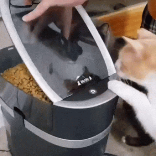 Descrierea conținutului: a person is feeding a cat from a feeder that says ' indoor ' on it
