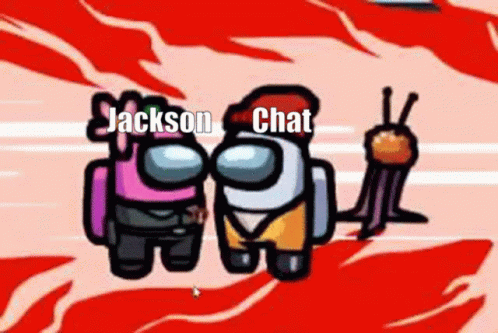Descrierea conținutului: two among us characters are standing next to each other with jackson chat written on the bottom