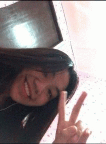 Descrierea conținutului: a girl is smiling and making a peace sign with her fingers .