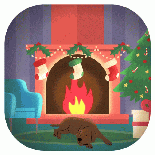 Descrierea conținutului: a dog is laying in front of a fireplace with christmas stockings on it