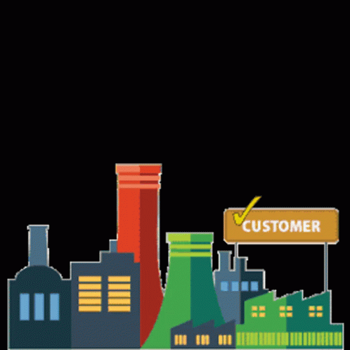 Descrierea conținutului: a cartoon illustration of a factory with a sign that says customer