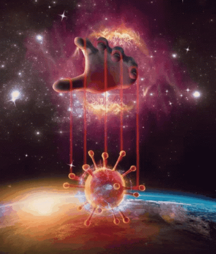 Descrierea conținutului: a painting of a hand holding a virus in the air