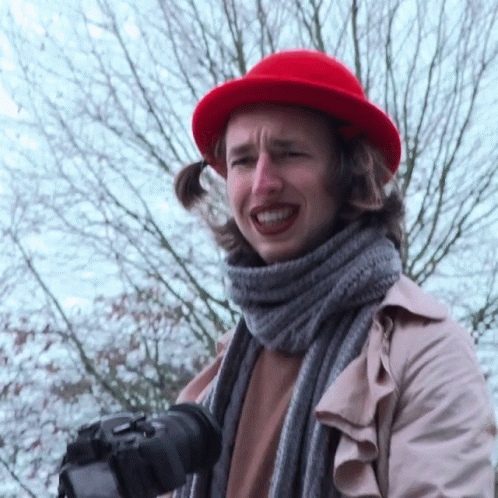 Descrierea conținutului: a woman wearing a red hat and a scarf holds a camera