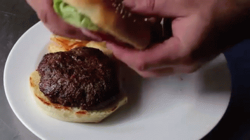 Descrierea conținutului: a person is putting a hamburger on a bun on a plate .