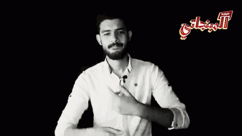 Descrierea conținutului: a man in a white shirt stands in front of a black background with arabic writing on it