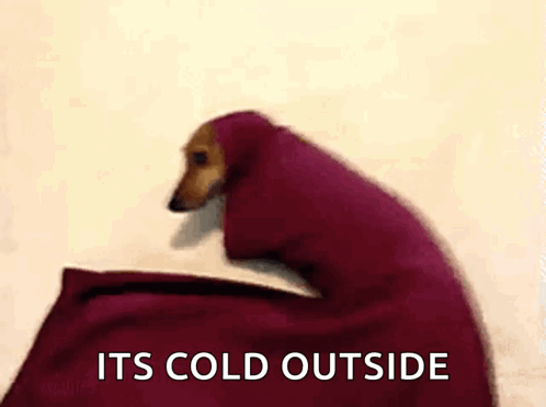 Descrierea conținutului: a dachshund wrapped in a red blanket with the words `` it 's cold outside '' above it .