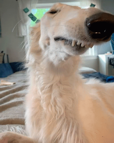 Descrierea conținutului: a white dog laying on a bed with its mouth open and teeth showing