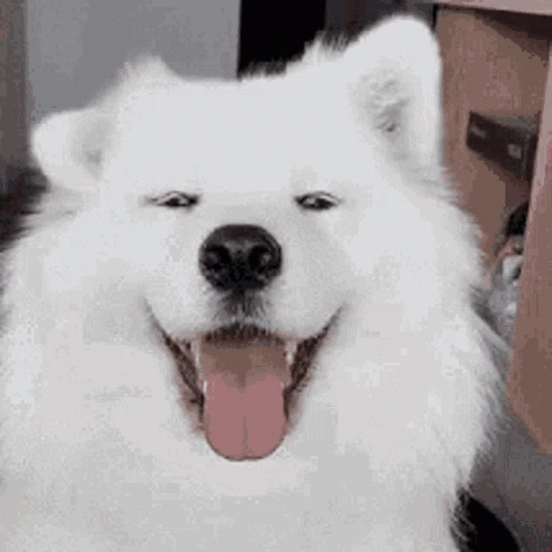 Descrierea conținutului: a white dog with its tongue hanging out is smiling .