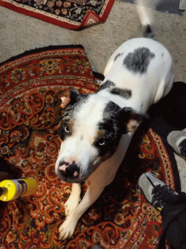 Descrierea conținutului: a black and white dog is laying on a rug and looking at the camera