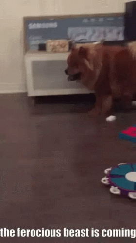 Descrierea conținutului: a dog playing with a toy in a room with the words the ferocious beast is coming below it