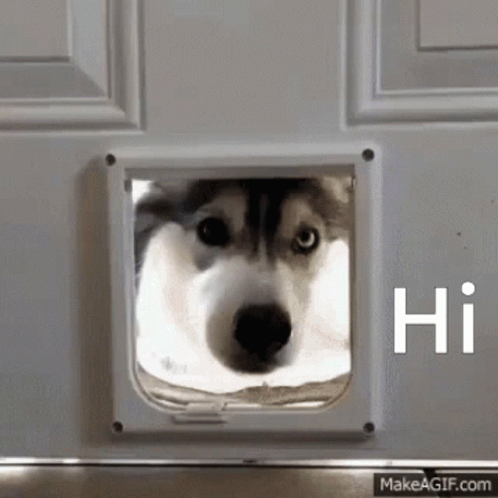 Descrierea conținutului: a husky dog looking through a cat door that says hi on the bottom