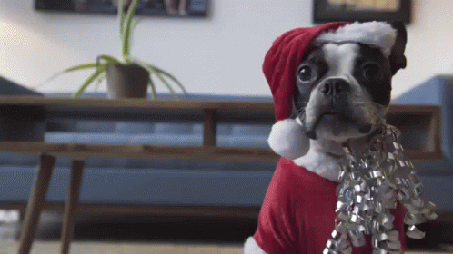 Descrierea conținutului: a small dog wearing a santa hat and tinsel around his neck