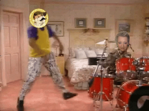 Descrierea conținutului: a man in a yellow shirt is dancing next to a woman playing drums in a bedroom
