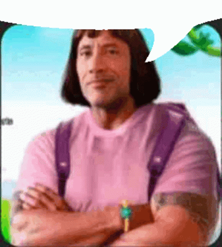 Descrierea conținutului: a man in a pink shirt and a purple backpack is standing with his arms crossed .