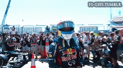Descrierea conținutului: a man wearing a red bull jacket and helmet is standing in front of a crowd .