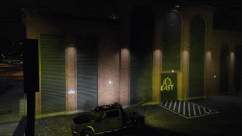 Descrierea conținutului: a tow truck is parked in front of a building that says east
