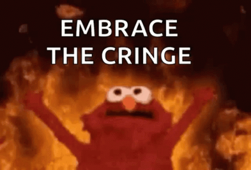 Descrierea conținutului: elmo is standing in front of a fire with the words `` embrace the cringe '' .