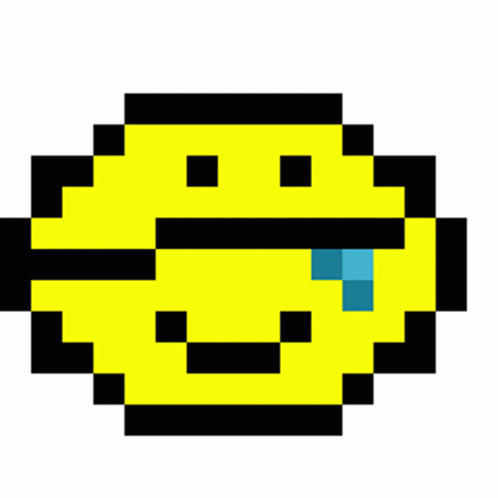 Descrierea conținutului: a pixel art illustration of a yellow smiley face with its tongue out .