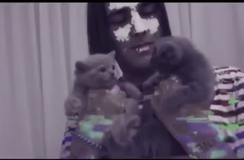 Descrierea conținutului: a man with a mask on his face is holding two kittens .