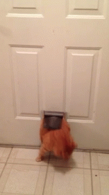 Descrierea conținutului: a cat is coming out of a cat door on a tiled floor