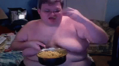 Descrierea conținutului: a shirtless man is holding a pot of food in front of his face