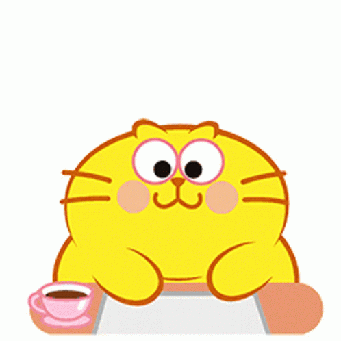 Descrierea conținutului: a cartoon cat is sitting at a table with a cup of coffee and a heart above it .