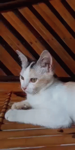 Descrierea conținutului: a white and brown cat is laying on a wooden chair looking at the camera .