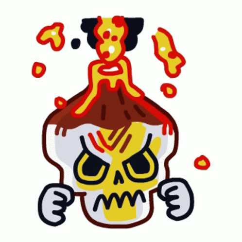 Descrierea conținutului: a cartoon drawing of a skull with a volcano erupting out of it