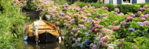Descrierea conținutului: a boat is floating in a river surrounded by pink and blue flowers
