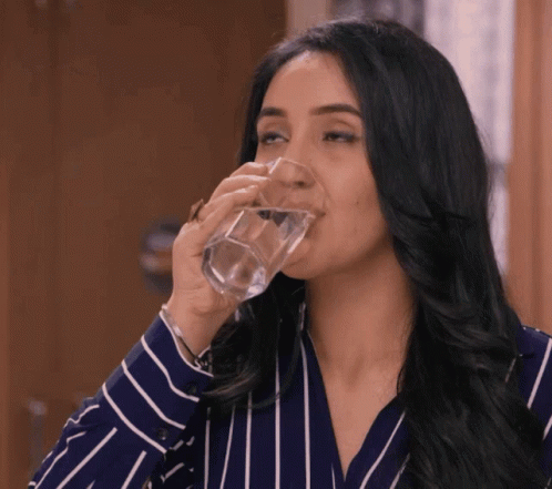 Descrierea conținutului: a woman in a striped shirt is drinking from a glass