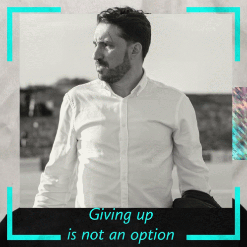 Descrierea conținutului: a black and white photo of a man with the words giving up is not an option above him