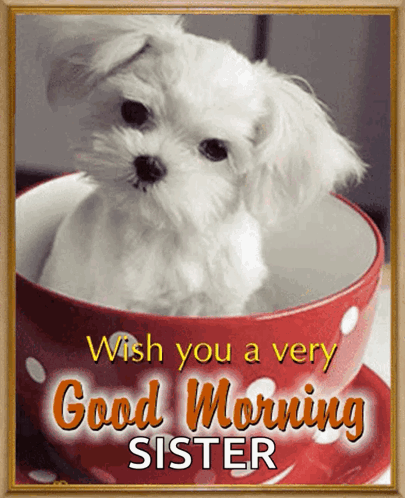 Descrierea conținutului: a picture of a small white dog in a red cup with the words wish you a very good morning sister