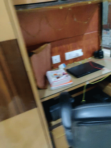 Descrierea conținutului: a blurred image of a desk with a monitor and a book on it