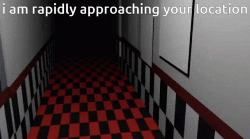 - Descrierea conținutului: a hallway with a checkered floor and the words " i am rapidly approaching your location " on the bottom