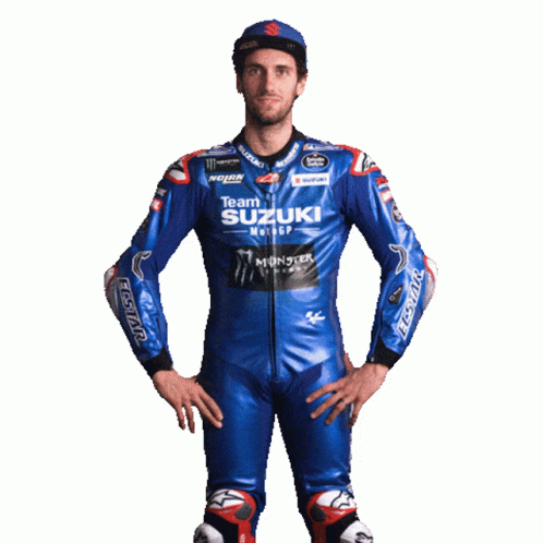 Descrierea conținutului: a man in a blue suzuki motorcycle suit stands with his hands in his pockets