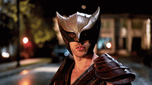 Descrierea conținutului: a man wearing a owl mask and armor stands on a street at night
